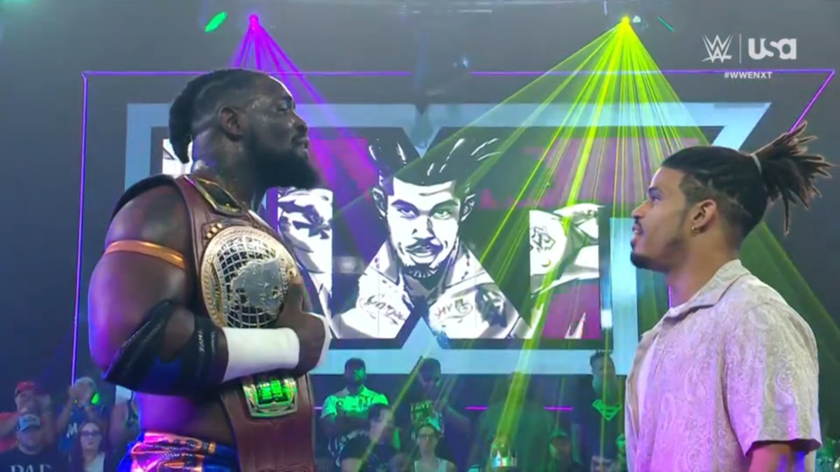 Following Oba Femi’s victory over Ivar to retain his NXT North American Championship, Femi’s victory celebration was quickly cut short by Lee’s music playing interrupting him. Lee came out from the crowd and leaped from the barricade to the steel steps and went into the ring to confront Femi. The two engaged in a staredown in the ring while Femi lifted up his NXT North American title in front of Lee.