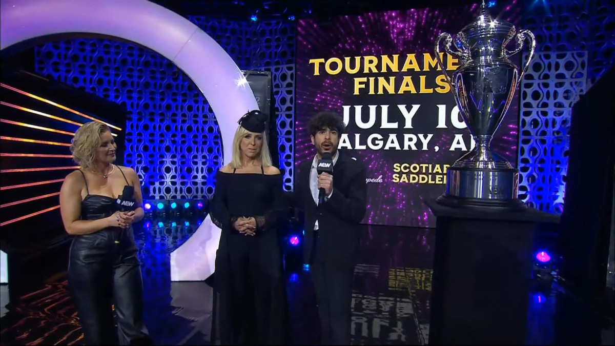 During the Buy-In Pre-show, Dr. Martha Hart and AEW CEO Tony Khan came out to the stage. Hart stated that they wanted to do something special for this year’s tournaments in honor of this year being the 25th anniversary of Owen Hart’s tragic passing. Khan responded stating that the Finals of this year’s tournaments will be taking place on July 10th at the Scotiabank Saddledome in Calgary, Alberta, Canada.