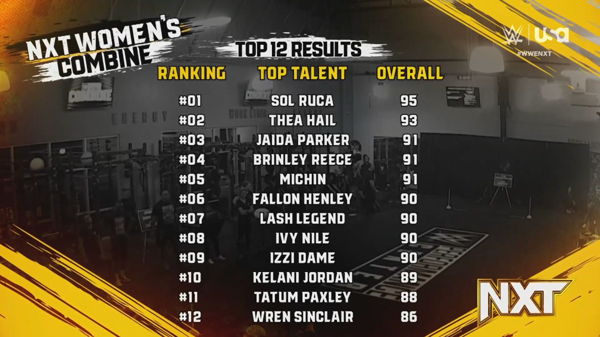 In a follow-up backstage segment, NXT General Manager Ava revealed the results of the combine and stated that Sol Ruca, Thea Hail, Jaida Parker, Brinley Reece, Michin, Fallon Henley, Lash Legend, Ivy Nile, Izzi Dame, Kelani Jordan, Tatum Paxley, and Wren Sinclair all advanced to the qualifying round for the NXT Women’s North American title Ladder match. Ruca was revealed to had the the top qualifying score while Sinclair had the lowest qualifying score. Ava stated that qualifier matches will officially take place starting at next week’s NXT show.