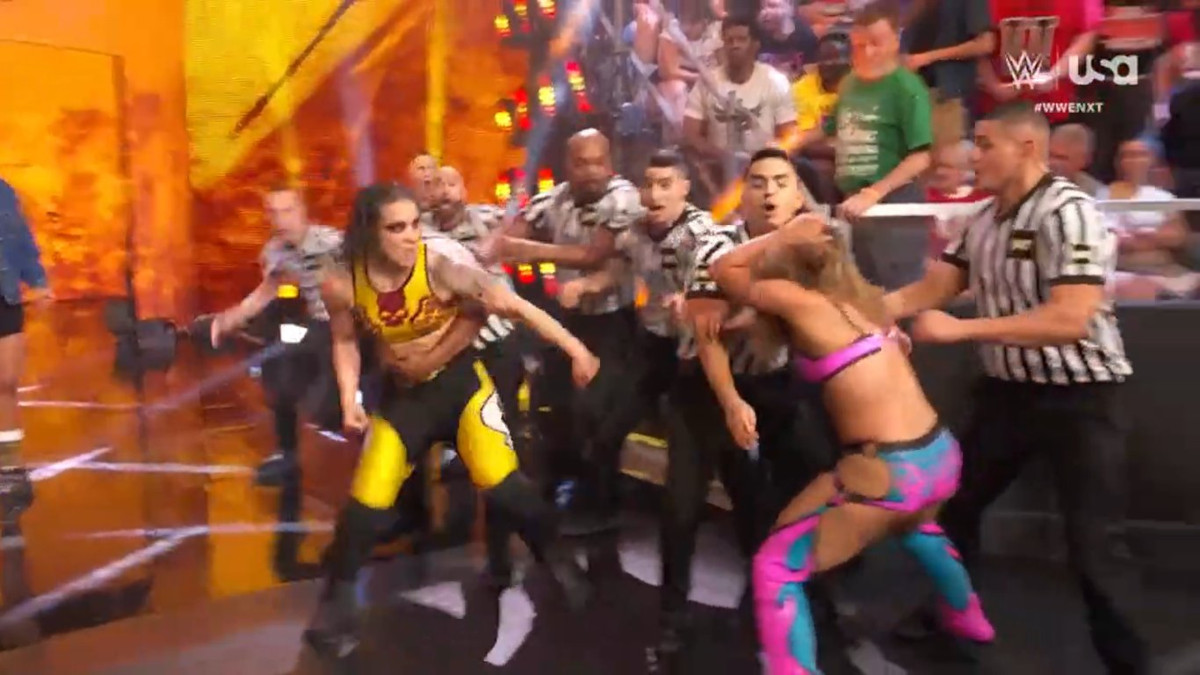 - Near the end of the match, No Quarter Catch Crew ran out from the crowd and attacked Tony D’Angelo leading to Stacks getting distracted and Frazer rolling him up to retain the NXT Tag Team titles.