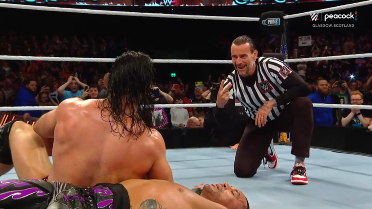 Near the end of the WWE World Heavyweight Championship match between McIntyre and Damian Priest, McIntyre grabbed Priest and sent him into the corner causing the referee to get hit by accident and the referee crashing out to the floor. McIntyre then hit a Claymore Kick for a near fall that had no referee around to count until one ran out to the ring. This referee’s face was obstructed by the camera and counted to two before stopping. This referee revealed himself to be CM Punk and gave McIntyre the middle finger leading to an angry McIntyre confronting Punk in the corner only to get a low blow kick in return by Punk. This led to the original referee regaining his senses and got back into the ring as Priest hit a South of Heaven to McIntyre for the pinfall victory.