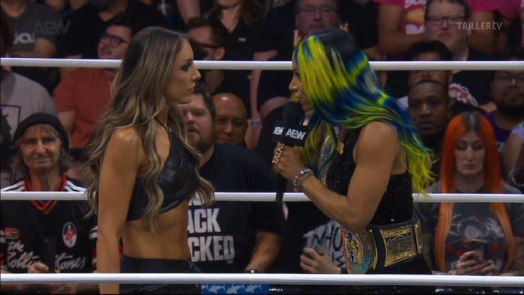Mone then came out to the ring and grabbed a microphone saying “oops, Britt did I interrupt something?” After some more words boasting about herself and mocking the Chicago crowd, Mone told Baker to get a look at what a real star looks like. Baker responded back stating “All In.” Baker talked about how she was the first female to wrestle at All In and wrestled at All In last year when Mone was looking like a broken bitch with a broken leg in the stands. Baker then issued a challenge to Mone at All In 2024. Mone responded stating Britt eeds to get in the back of the line. Baker responded asking Mone “what line?” leading to Mone responding back stating that “there is a price to pay when you mess with Mercedes Mone.” Mone then held up her TBS and NJPW Strong Women’s titles and left the ring.