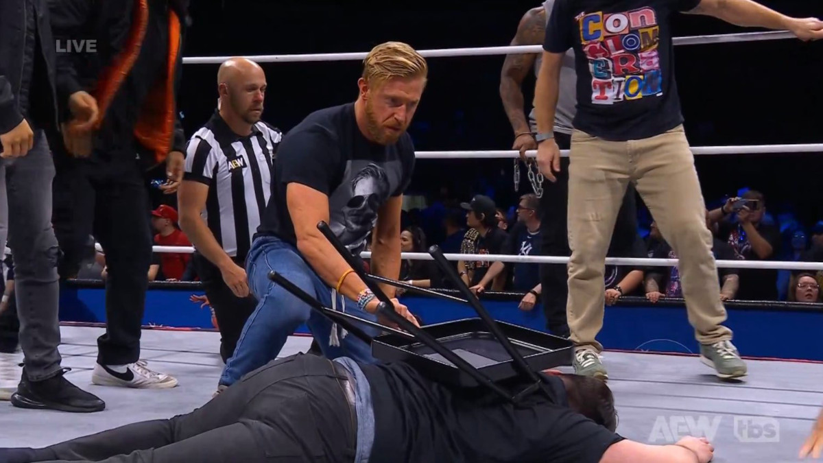 In a follow-up segment, Jon Moxley and his group showed up at the end of the show and proceeded to take out Daniel Garcia & Private Party following Garcia and Private Party’s victory over the Elite. Moxley came out to the ring dragging Taylor with him and tossed him into the ring. Claudio Castagonli placed a chair on Taylor’s left but before he could do anything else, Wheeler Yuta pulled the chair off leading to Castagnoli putting it back but on Yuta’s neck instead. Castagnoli then proceeded to stomp onto the chair as Cassidy ran out trying to save his friend to no avail. Moxley and his group then left the ring and through the crowd as the rest of AEW’s locker room ran out to chase them off while AEW officials and medics rushed to the ring to attend to Taylor.