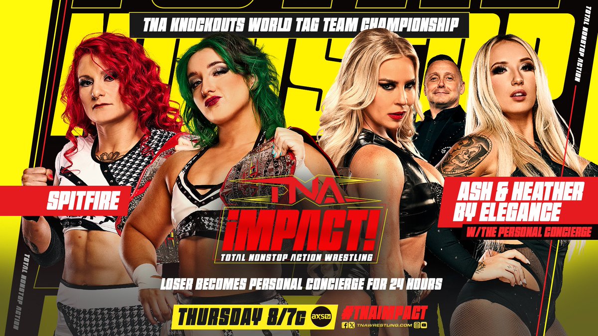 The second new match announced was a TNA Knockouts World Tag Team Championship match of Heather & Ash By Elegance vs. Spitfire (Jody Threat & Dani Luna) (c).