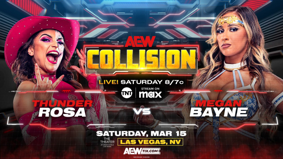 After weeks of tension + altercations, former @AEW Women’s World Champion Thunder Rosa will collide vs Megan Bayne on Saturday Night Collision,