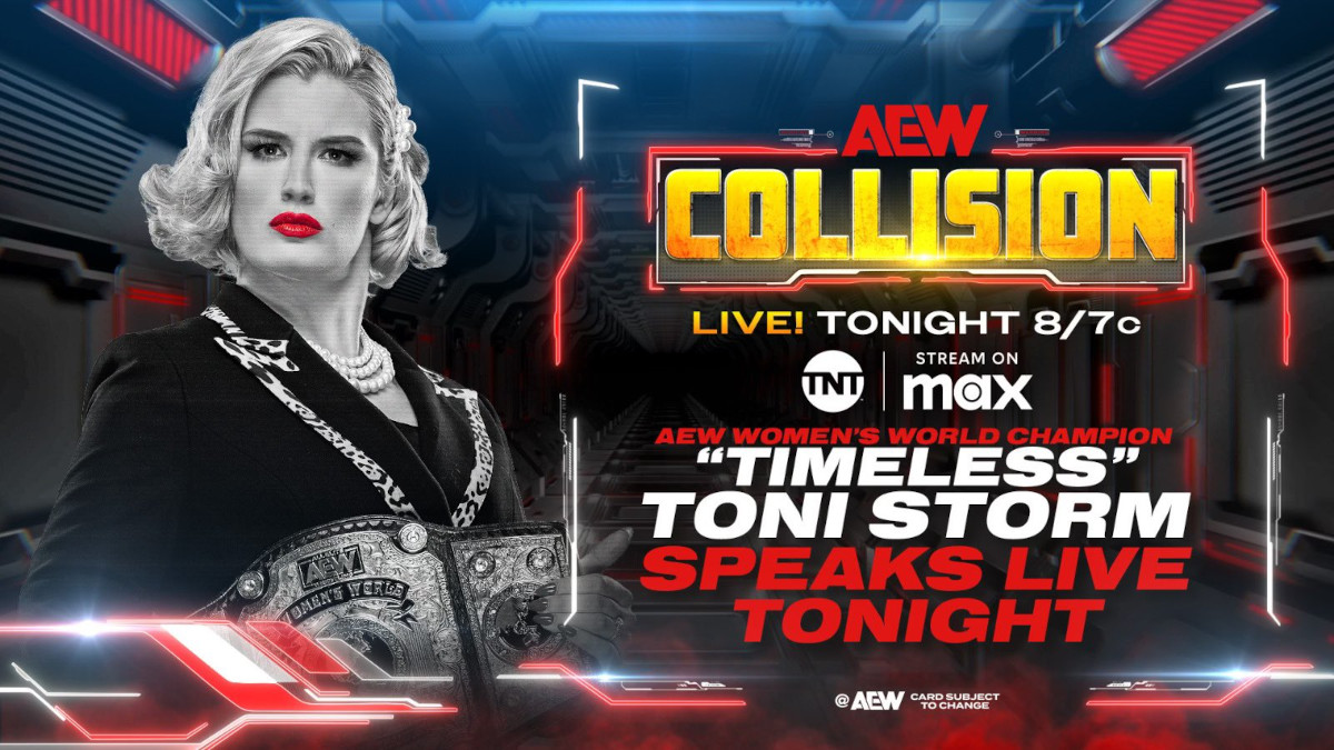 Before her #AEWDynasty Women’s World Title match vs red hot challenger @meganbayne next Sunday, we’ll hear from World Champion Toni Storm live to start Collision TONIGHT! pic.twitter.com/9B6WUg8JyN