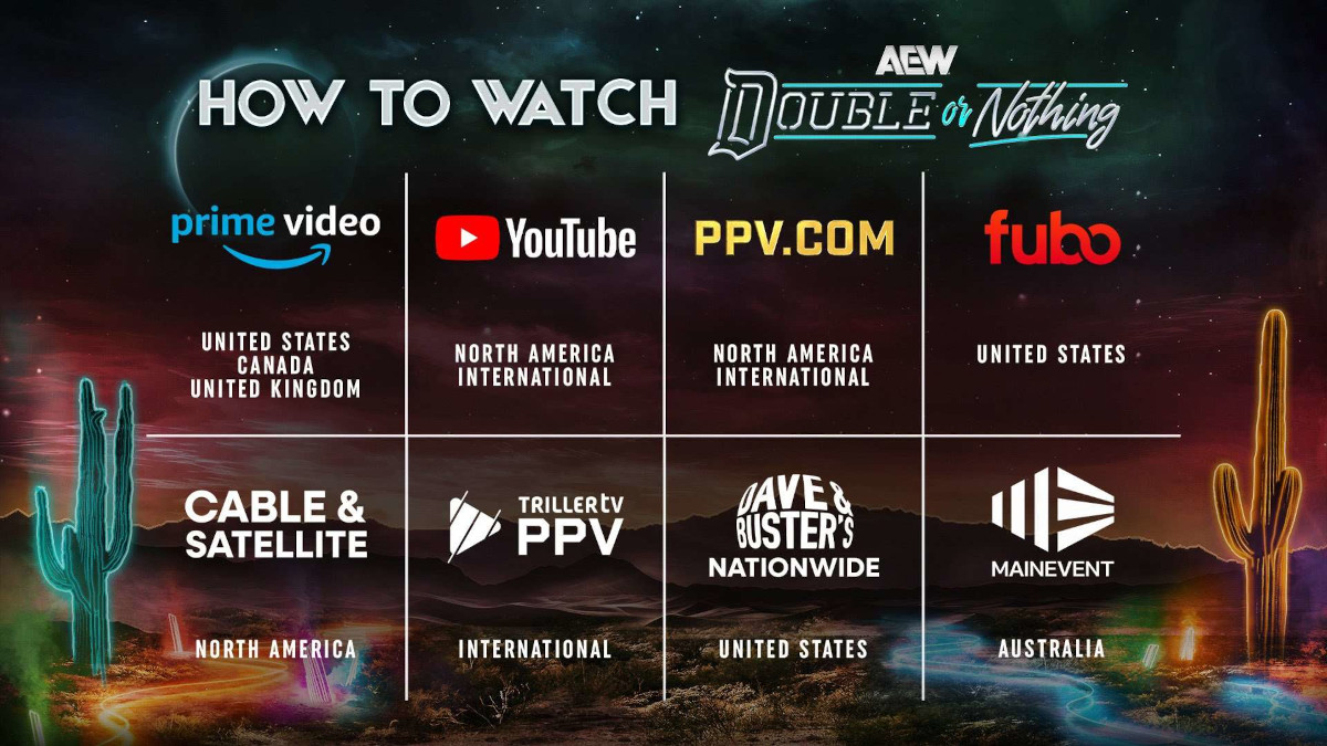In regards to North America, it was announced that Double or Nothing 2025 will be available to purchase and watch on Prime Video, YouTube TV, PPV.com, Fubo (US only), and cable TV and satellite providers. It was also announced that the event will be available to watch at Dave & Busters locations nationwide in the U.S.