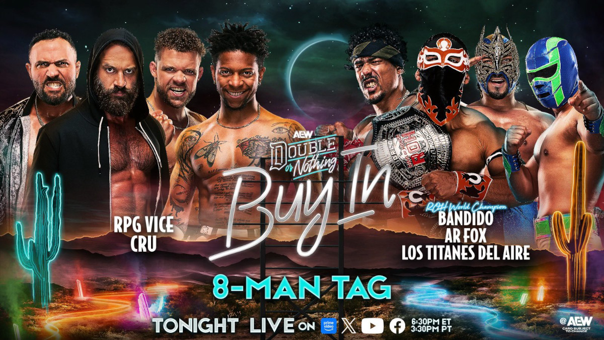 This new match announced was an Eight-Man Tag Team match of RPG Vice (Rocky Romero & Trent Beretta) & Cru (Action Andretti & Lio Rush) vs. Bandido, AR Fox, & Los Titanes del Aire (Komander & Hologram). It was also announced that this match will be taking place at Double or Nothing’s Buy-In pre-show.