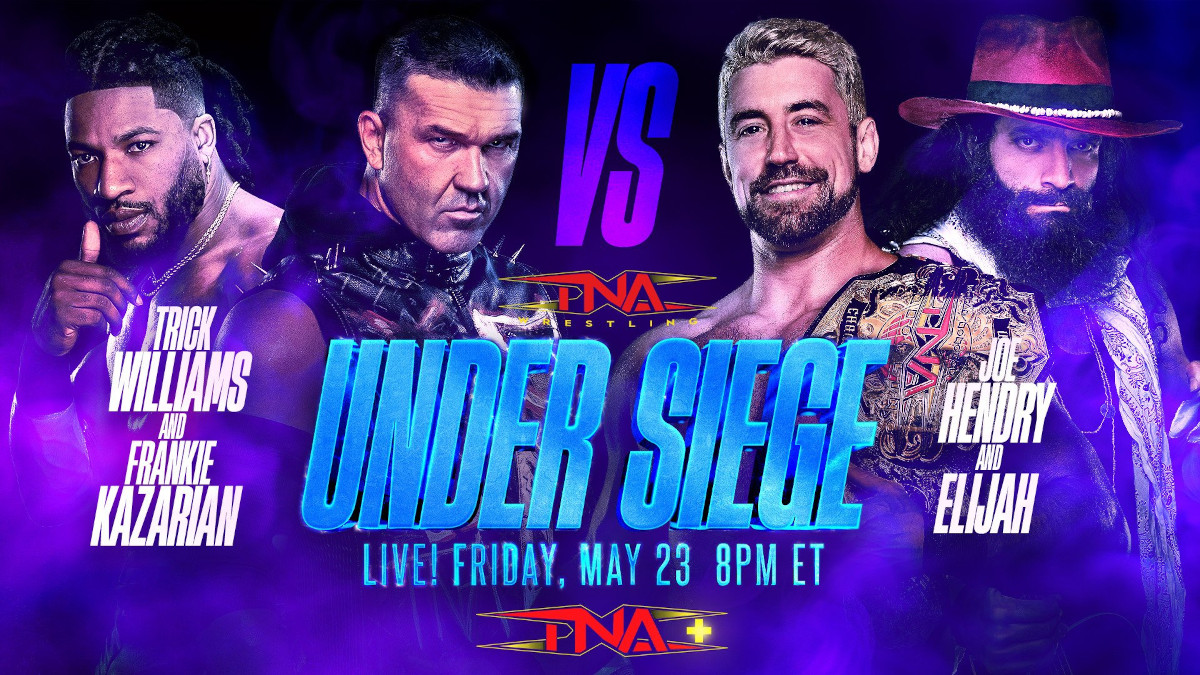 BREAKING: @joehendry teams with @_Iam_Elijah_ to battle @FrankieKazarian & #WWENXT's @_trickwilliams at #TNAUnderSiege, May 23 from the CAA Centre in Brampton, Ontario (GTA) LIVE on TNA+!