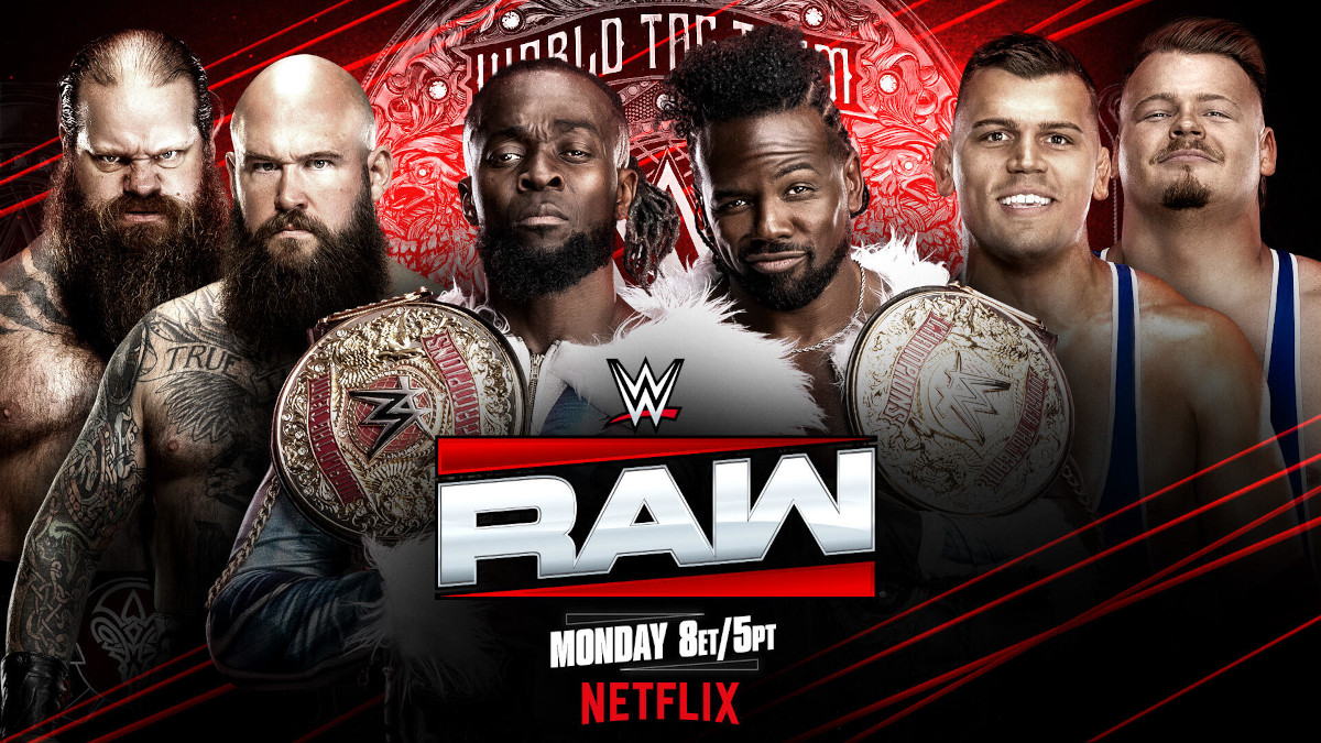 A brawl breaks out between the teams as the referee holds the titles up. The War Raiders clear the ring and flip Kofi Kingston out of the ring onto the other competitors. Ivar and Erik go to the apron. Erik scoop slams Ivar off the apron onto the competitors!