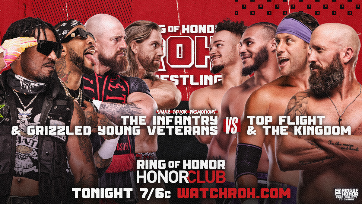 Eight men, from four teams, teaming together on two teams, to beat the heck out of each other. The Grizzled Young Veterans haven’t been around ROH in a spell and The Kingdom have popped in and out over the last few months. The Infantry has been causing trouble with Shane Taylor Promotions and Top Flight have been flying high, so to speak.