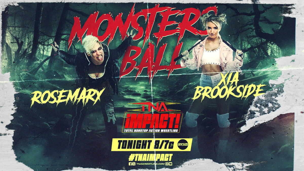 The package promoting the Monster’s Ball match wraps up, and the show returns inside the Impact Zone, where the lights go down and Rosemary makes her way to the ring. She looks right at home, despite a rough 24 previous hours. Brookside comes out and looks like she was just born.