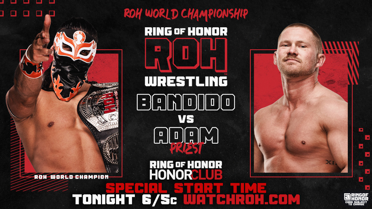 - ROH World Championship – Bandido (c) defeated Adam Priest via Frog Splash (pinfall)