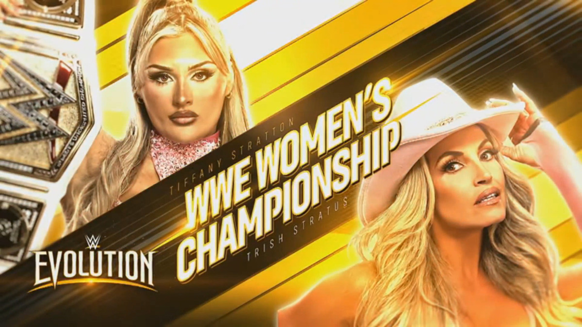 Official graphic for Tiffany Stratton vs. Trish Stratus for the WWE Women’s Championship at Evolution!#SmackDownpic.twitter.com/7aPnhb9KGH