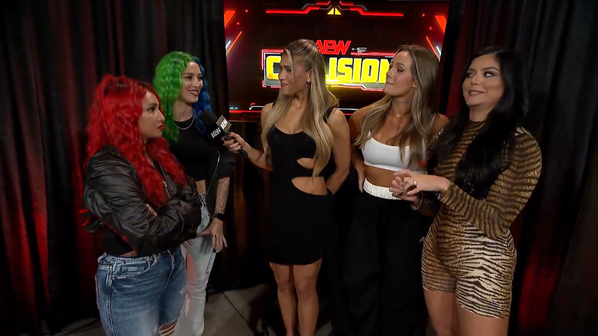 During the show, TayJay (Tay Melo & Anna Jay) were seen backstage for an interview with Lexy Nair for some words about their upcoming tag team match in the AEW Women’s World Tag Team Championship tournament. This led to Alize and Newell showing up to interrupt and after some words, they issued a challenge to TayJay for a match, which TayJay agreed.