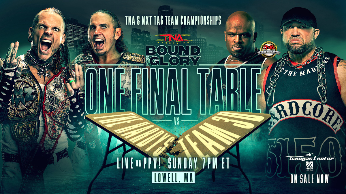 BREAKING: After their historic victory on last night’s #WWENXT, The Hardys vs. Team 3D: One Final Table at #TNABoundForGlory LIVE on PPV and TNA+ THIS SUNDAY will now be for both the TNA and @WWENXT Tag Team Titles!