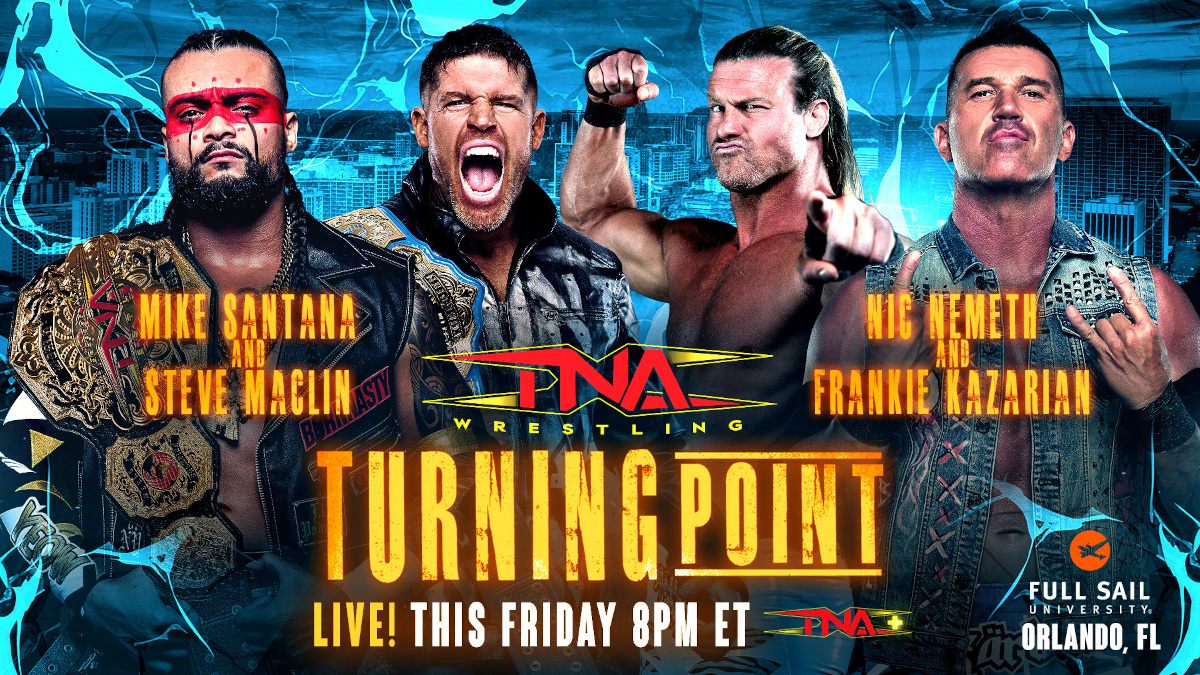 BREAKING: TNA World Champion @Santana_Proud and TNA International Champion @SteveMaclin will face @NicTNemeth and @FrankieKazarian THIS FRIDAY at #TNATurningPoint LIVE on TNA+ from Full Sail University in Orlando.