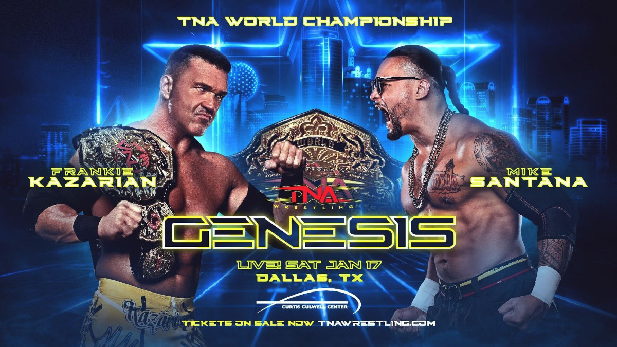 BREAKING: @FrankieKazarian will defend the TNA World Championship against @Santana_Proud at #TNAGenesis — LIVE on Saturday, January 17 from the Curtis Culwell Center in Dallas, Texas.