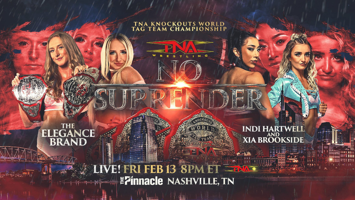 BREAKING: The TNA Knockouts World Tag Team Championship is on the line as The Elegance Brand defend against @indi_hartwell & @XiaBrookside at #TNANoSurrender LIVE! TOMORROW NIGHT at 8PM ET from The Pinnacle in Nashville, TN! @justmaggielee @Heathereckless